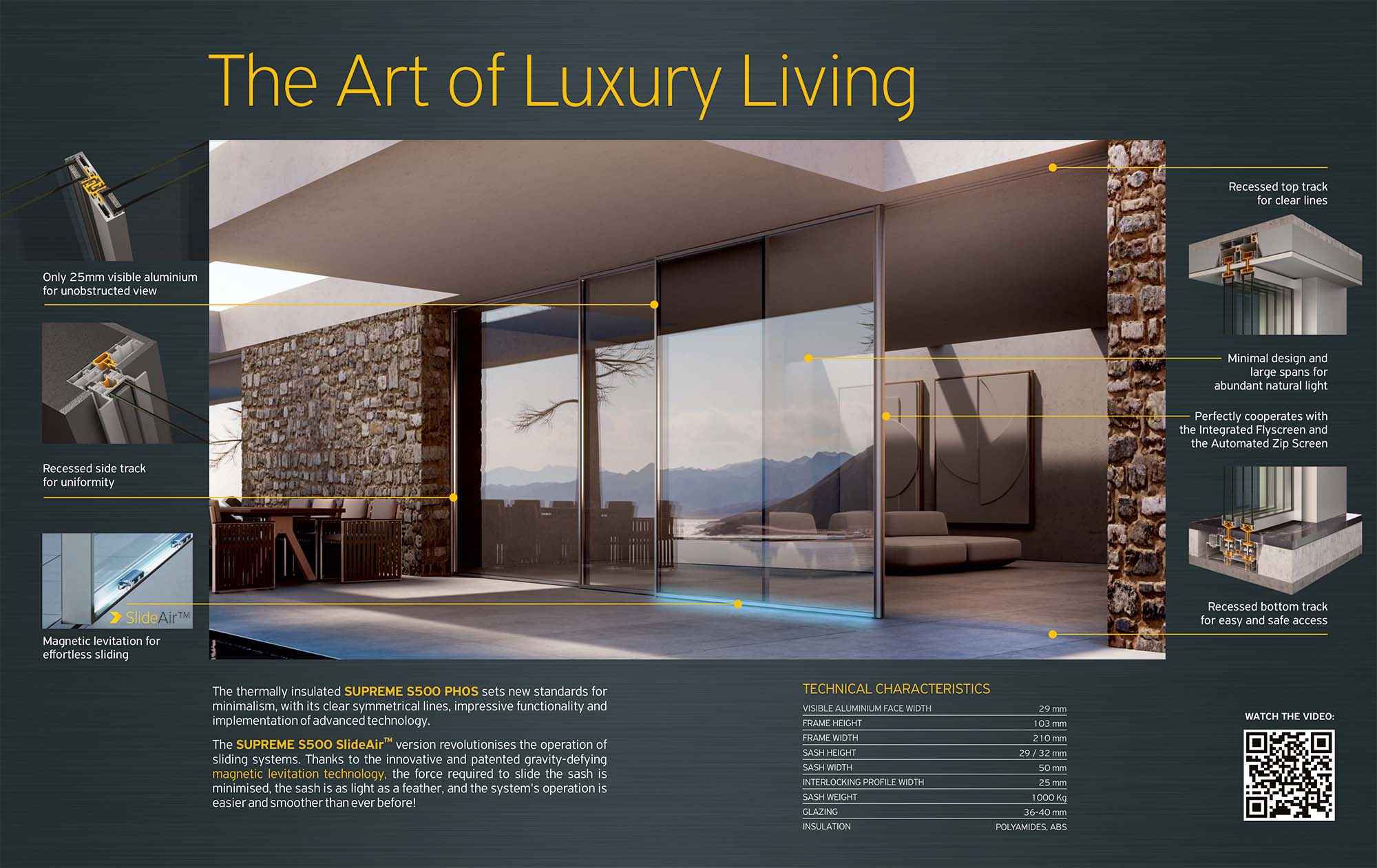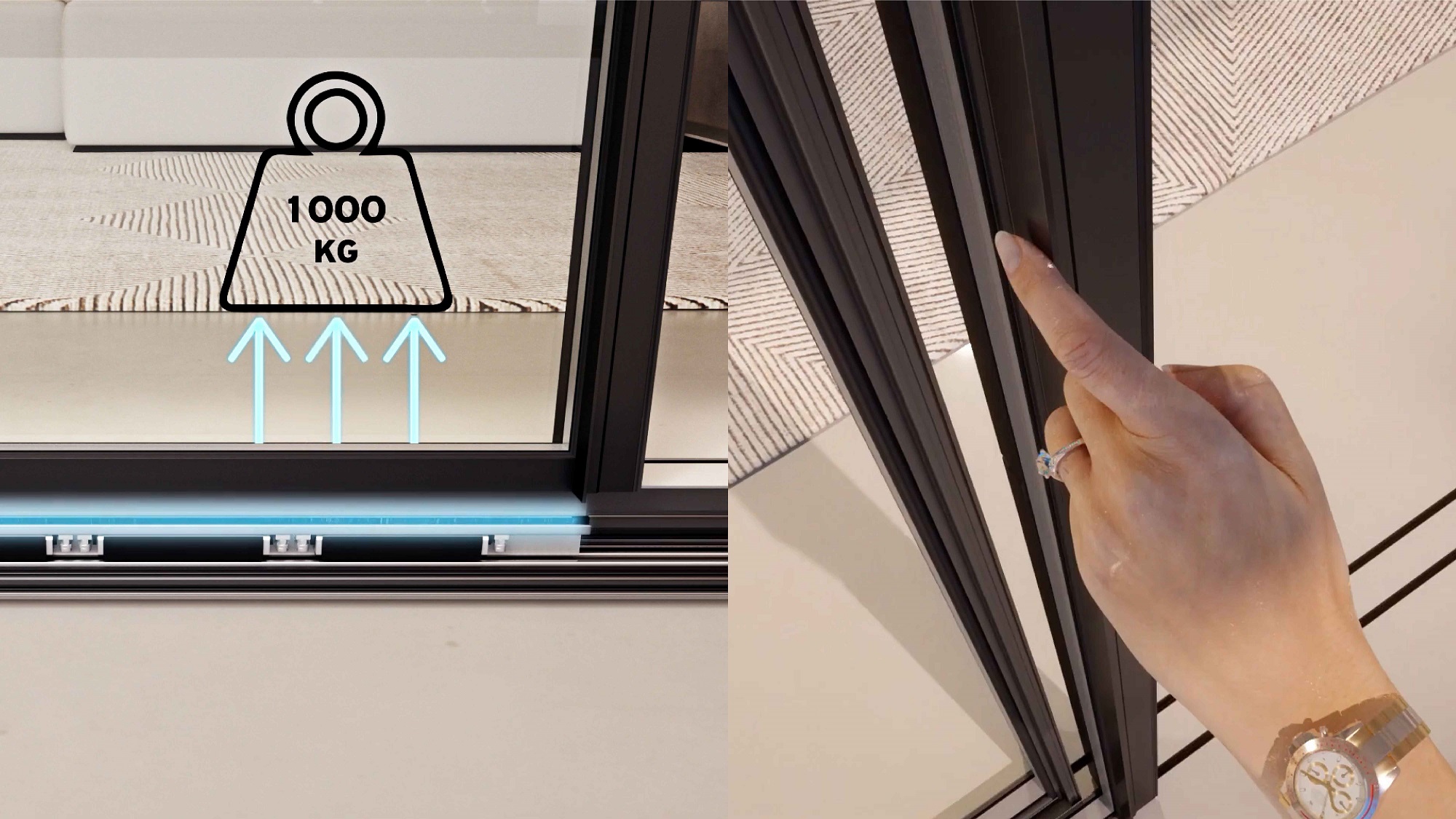 Kích thước lớn hơn, mỗi cánh lên tới 4x4m, trong khi độ dày thanh profile nhìn thấy chỉ 25mm. Công nghệ từ tính được cấp bằng sáng chế trong hệ thống con lăn kết hợp nam châm giúp trọng lượng cánh lên tới 1000kg nhưng vẫn đảm bảo vận hành êm ái. Đây thực sự là một bước tiến vượt trội trong công nghệ cửa trượt có cầu cách nhiệt được sản xuất trực tiếp tại Châu Âu.