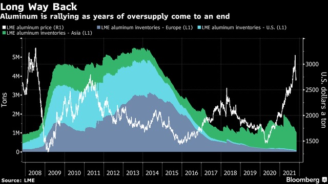 Khi đó, các nhà kinh doanh và ngân hàng bắt đầu tích trữ kim loại này. Vào những năm 2010, trong khi hàng núi kim loại này vẫn nằm ở các cảng lớn trên thế giới thì các nhà sản xuất lớn như Coca-Cola hay MolsonCoors vẫn thấy mình đang thiếu nhôm. Khi nhu cầu tăng trở lại, nhôm vẫn chỉ được cấp nhỏ giọt cho thị trường. Thậm chí vào năm ngoái, người ta còn tiếp tục lo sợ về tình trạng dư thừa tiếp tục diễn ra bởi đại dịch.