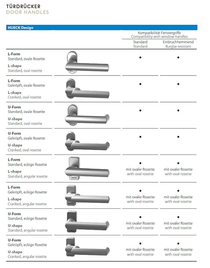 Dòng tay nắm Hueck bao gồm loại cho cửa sổ và cửa đi với các thiết kế khác nhau, có thể bổ sung khóa cửa tùy thích. Tay nắm có sẵn bằng nhôm hoặc thép, màu tự nhiên hoặc trắng. Ngoài ra Hueck cũng cung cấp tay nắm với bất kỳ màu sắc nào theo yêu cầu của khách hàng.
