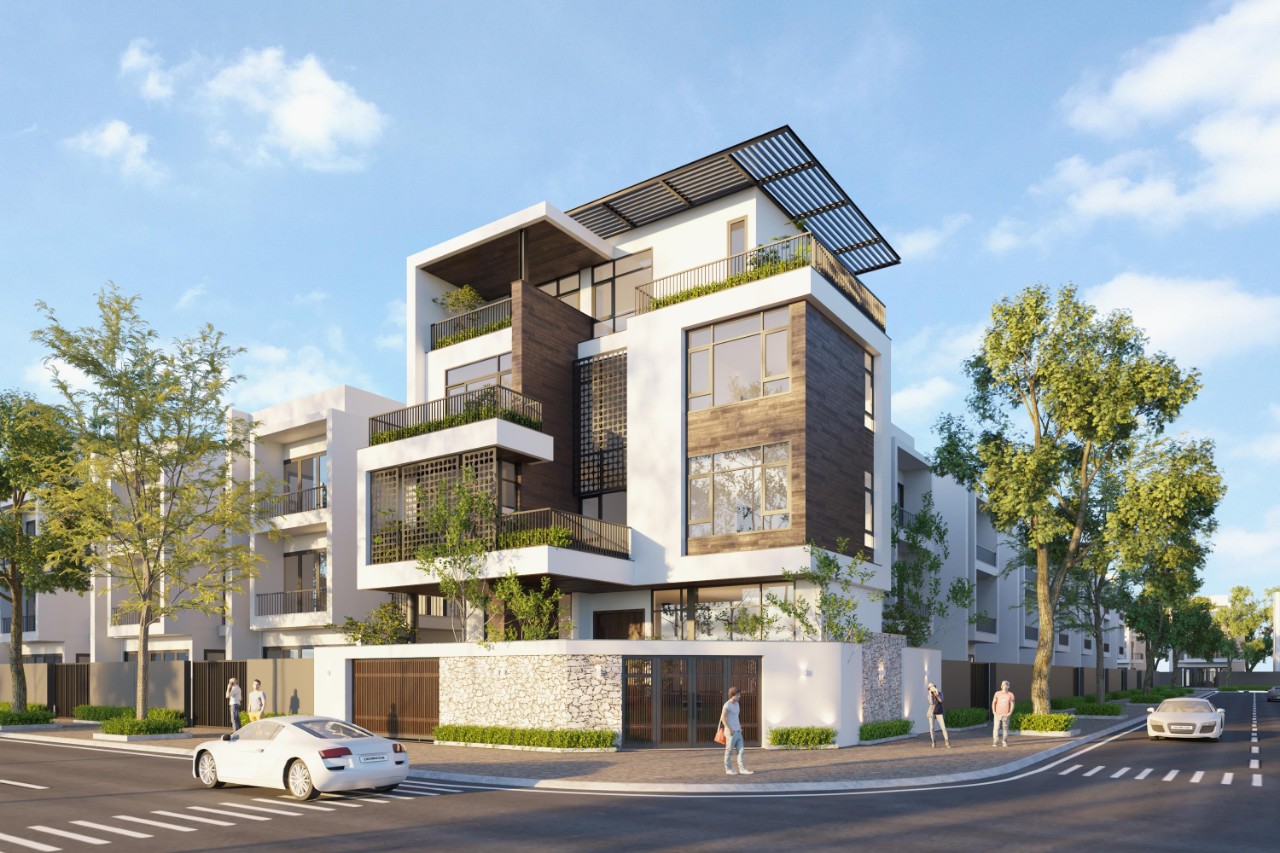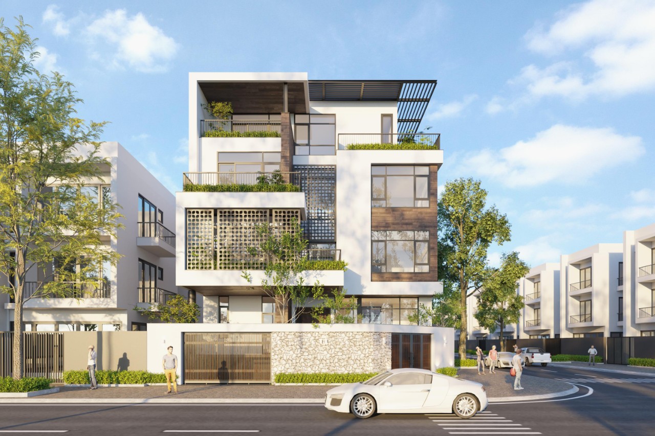 Căn biệt thự được xây dựng trên diện tích 250 m2 , lô góc với 2 mặt tiền thoáng mát. Công trình có 3,5 tầng, ở vị trí tầng 2 được thiết kế xây dựng bể cá Koi cùng hệ thống cây xanh tạo cảm giác gần gũi với thiên nhiên. Biệt thự lấy màu trắng làm chủ đạo, kết hợp với hệ thống cửa nhôm màu ghi ánh kim, ốp đá màu vân gỗ đem tới vẻ ngoài sang trọng và hiện đại. Biệt thự sử dụng cả hai loại cửa sổ mở lùa và mở hất, đặc biệt là vách dựng thông suốt từ tầng 2 lên đến mái tạo điểm nhấn cho toàn bộ công trình.