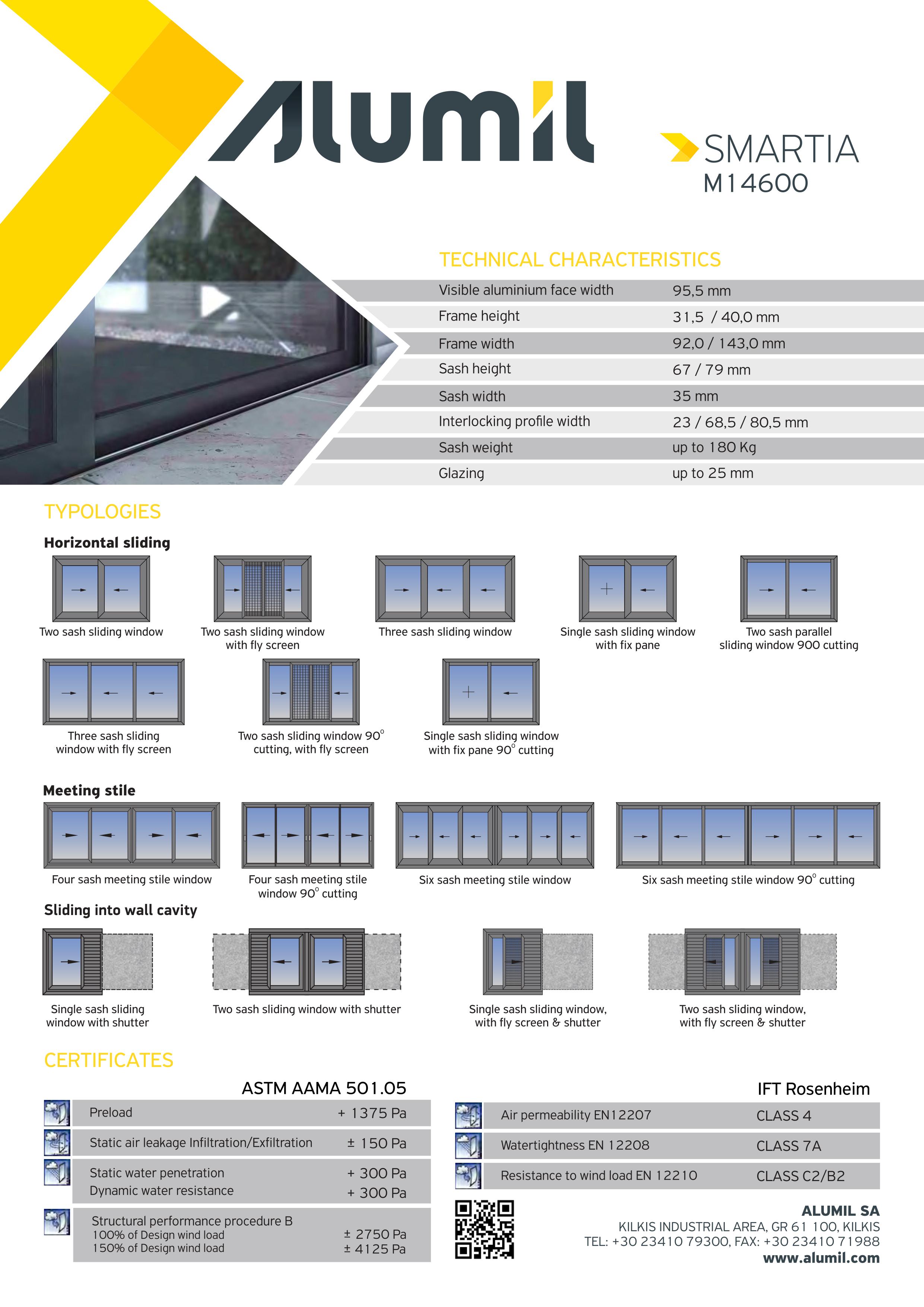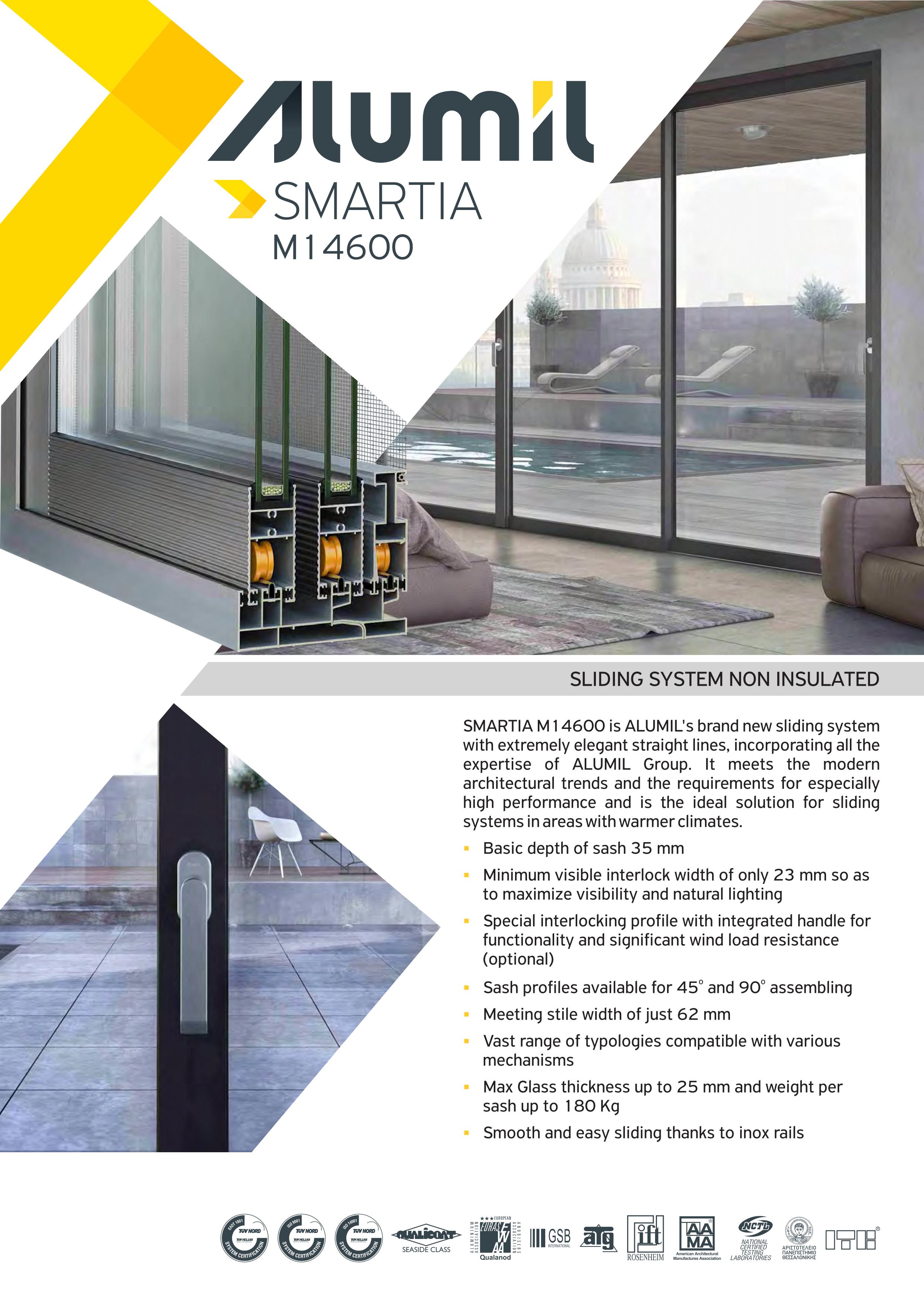 Hệ thống cửa trượt không cầu cách nhiệt SMARTIA M14600 là hệ thống trượt hoàn toàn mới của ALUMIL với các đường nét cực kỳ thanh lịch, tăng cường ánh sáng tự nhiên cho căn phòng nhờ tiết diện nhôm thanh mảnh.