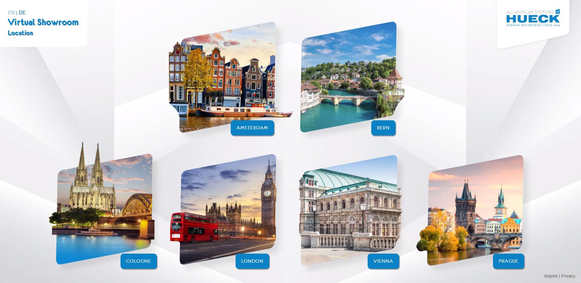 Hướng dẫn viên ảo Hannah sẽ đưa khách hàng qua các showroom của Hueck tại 6 thành phố xinh đẹp: Amsterdam, Bern, Cologne, London, Vienna và Prague. Tại showroom, khách hàng có thể trải nghiệm các dòng sản phẩm chính của Hueck, bao gồm Hệ thống cửa sổ cách âm Lambda SA, Hệ thống cửa sổ và cửa đi WS/DS, Hệ thống cửa trượt Volato, Hệ thống mặt dựng Trigon FS, Cửa chống trộm và Hệ thống cửa chống cháy Lava.