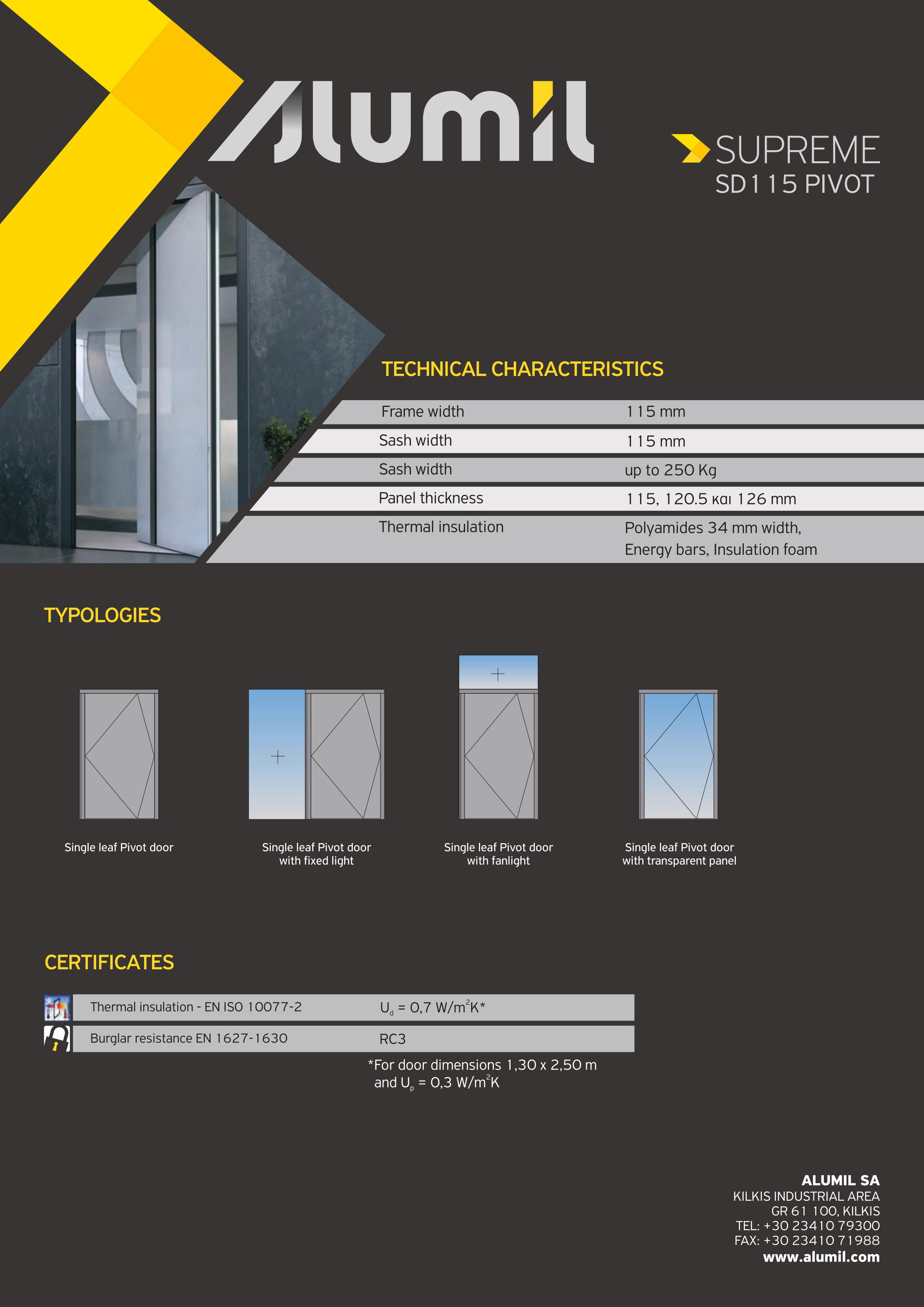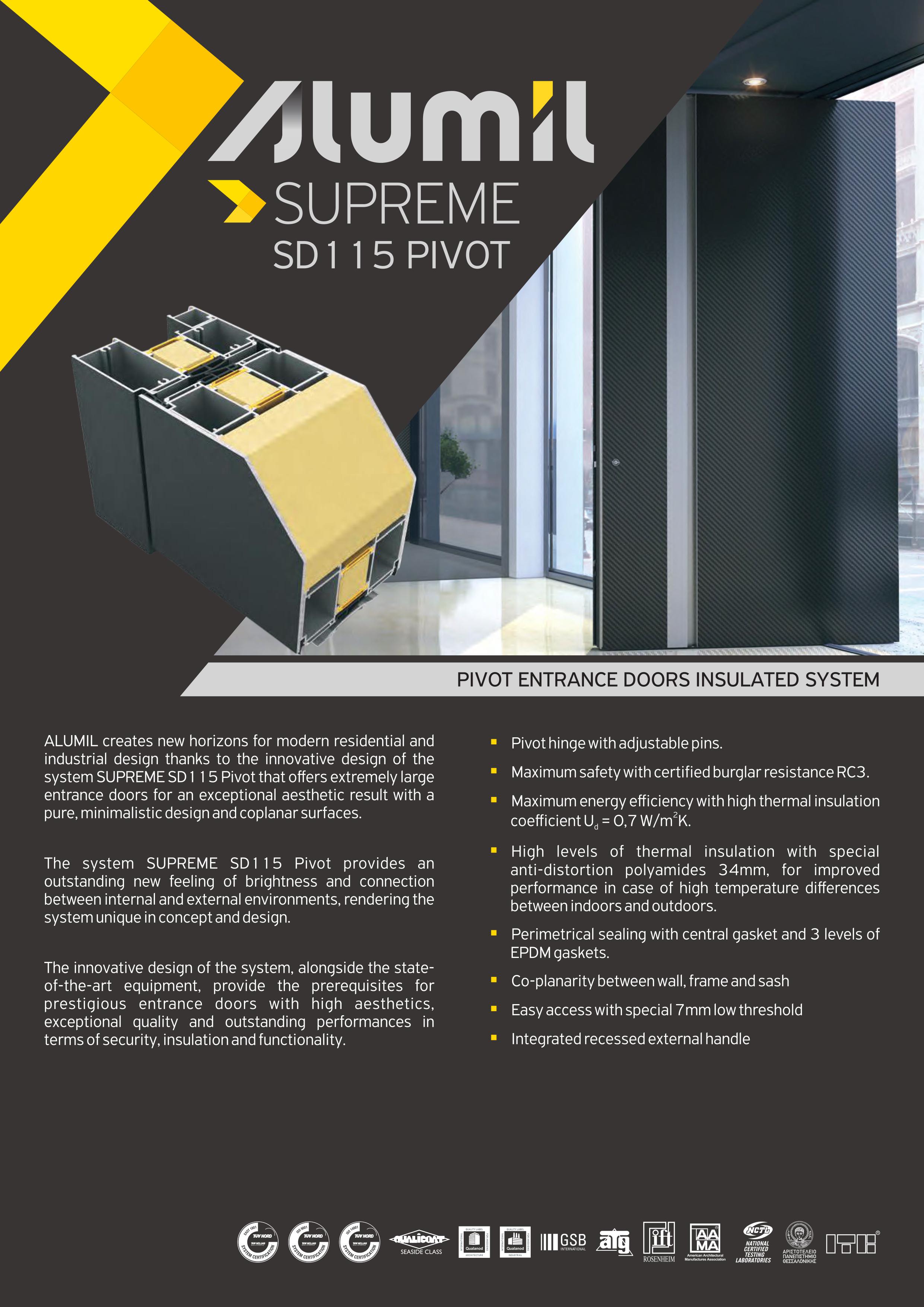 Hệ thống SUPREME SD115 Pivot với mức kháng chống trộm RC3, khả năng cách âm - cách nhiệt được chứng nhận tiêu chuẩn Passvihouse, tích hợp hệ thống khóa thông minh nhận diện khuôn mặt hoặc cảm biến vân tay đem tới sự tiện nghi và bảo mật cao.