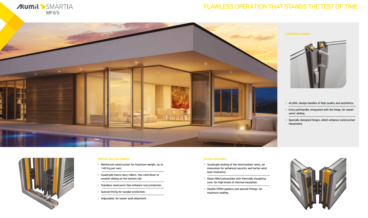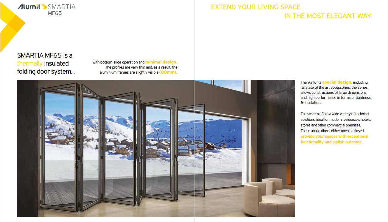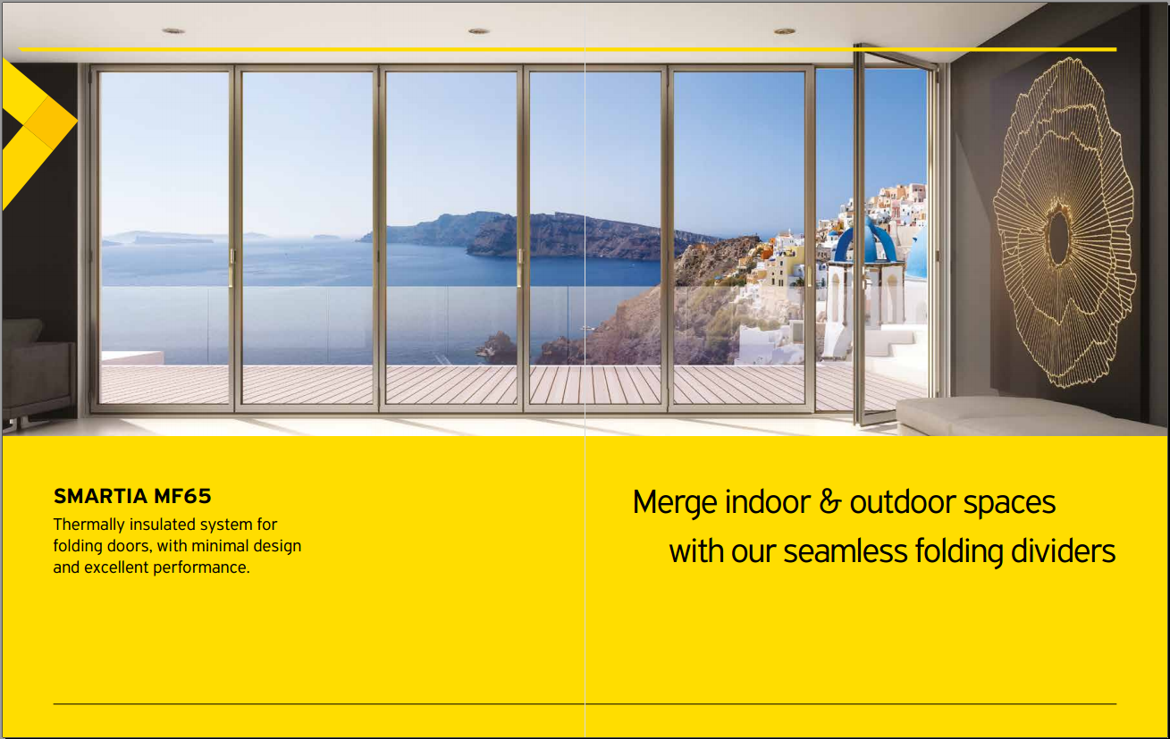 CỬA NHÔM NHẬP KHẨU CHÂU ÂU - SMARTIA MF65 là hệ thống cách nhiệt cho cửa xếp trượt với thiết kế tối giản và tiết diện nhôm thanh mảnh. Cửa MF65 cung cấp giải pháp cách nhiệt tuyệt vời, độ kín nước cao và lý tưởng cho các công trình lớn yêu cầu giá trị thẩm mỹ sâu sắc.