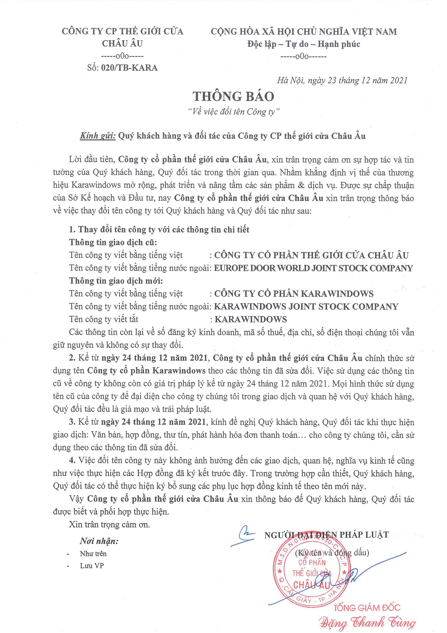 Nhằm khẳng định vị thế của thương hiệu Karawindows, mở rộng, phát triển và nâng tầm các sản phẩm & dịch vụ, đồng thời được sự chấp thuận của Sở Kế hoạch và Đầu tư, nay công ty Công ty cổ phần thế giới cửa Châu Âu, xin trân trọng gửi tới quý khách hàng và đối tác thông báo về việc thay đổi tên công ty.